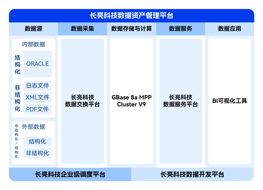 能力共進,推出金融數(shù)據(jù)倉庫聯(lián)合方案 雙方早已在產(chǎn)品適配認(rèn)證上提前布局,長亮科技數(shù)據(jù)倉庫解決方案與南大通用GBase 8a MPP Cluster V9已完成聯(lián)合測試,雙方產(chǎn)品完全兼容、運行穩(wěn)定,充分滿足金融機構(gòu)數(shù)據(jù)倉庫的建設(shè)需求。 綜合雙方在各自領(lǐng)域的創(chuàng)新優(yōu)勢,該聯(lián)合解決方案以南大通用GBase 8a MPP Cluster V9為核心構(gòu)件,輔以長亮科技數(shù)據(jù)開發(fā)平臺、數(shù)據(jù)交換平臺、企業(yè)級調(diào)度平臺、數(shù)據(jù)資產(chǎn)管理平臺、數(shù)據(jù)服務(wù)平臺,打造海量數(shù)據(jù)計算及復(fù)雜模型分析的技術(shù)平臺,實現(xiàn)跨業(yè)務(wù)領(lǐng)域數(shù)據(jù)的集中采集、存儲和共享,全面、及時、準(zhǔn)確展現(xiàn)關(guān)鍵系統(tǒng)的運行狀況與趨勢,助力金融機構(gòu)全面挖掘數(shù)據(jù)價值。 數(shù)據(jù)倉庫及其上下游系統(tǒng)邏輯關(guān)系圖 系統(tǒng)技術(shù)架構(gòu)圖