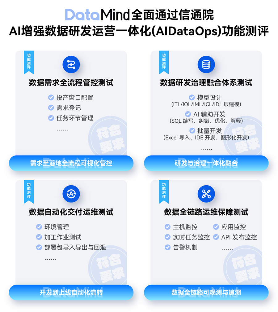 本次測(cè)評(píng)由信通院主導(dǎo),依據(jù)《AI 增強(qiáng) - DataOps 功能測(cè)試方案 V1.0 2025》標(biāo)準(zhǔn),對(duì)DataMind的AI增強(qiáng)DataOps組件展開了全方位、深層次的功能驗(yàn)證。