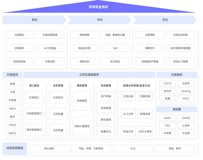 為金融機構(gòu)資金業(yè)務(wù)條線打造專業(yè)的、最大化自主可控的資金前中后一體化資產(chǎn)信息系統(tǒng),提供從前臺交易,中臺風(fēng)險,到后臺清算核算、報表統(tǒng)計等各項功能。