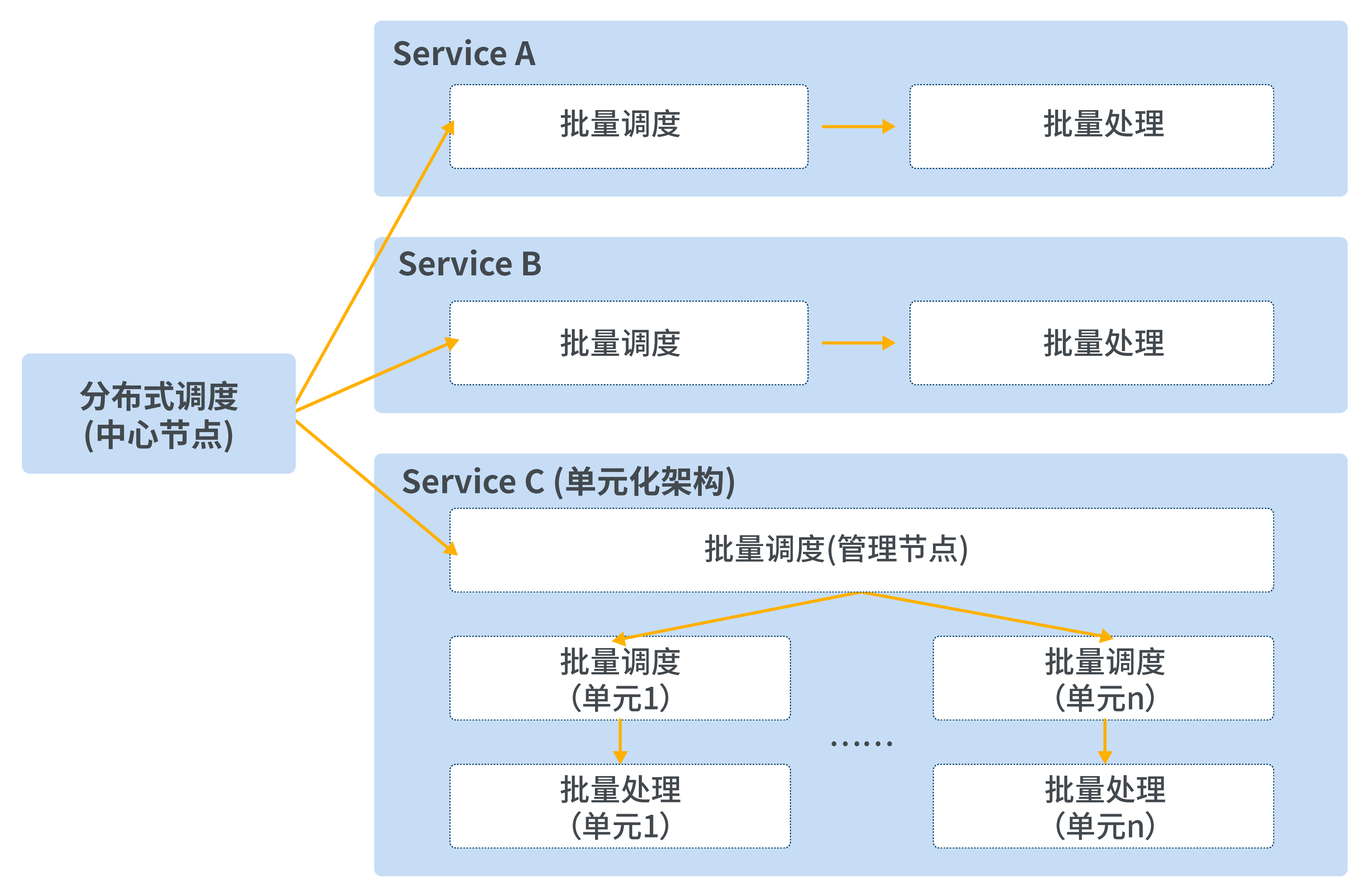 在復雜架構(微服務+單元化)下,分布式調(diào)度需要支持去中心化調(diào)度能力,以降低主節(jié)點的調(diào)度壓力,將調(diào)度分散到每個微服務,每個單元處理。