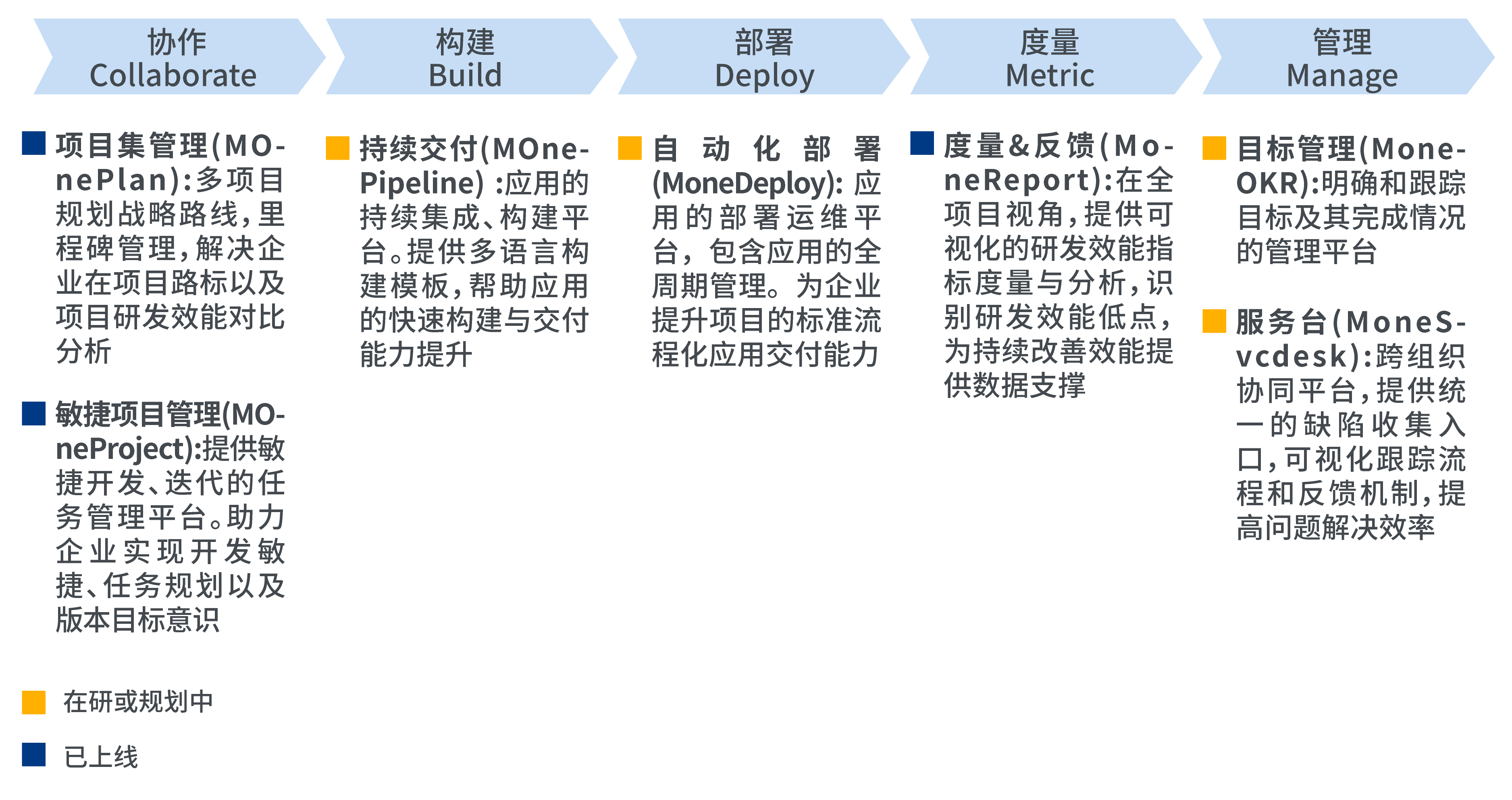 ◆ MOne覆蓋產(chǎn)品研發(fā)全生命周期,從目標(biāo)規(guī)劃、需求管理、迭代跟蹤、代碼管理、構(gòu)建管理、測(cè)試管理、部署發(fā)布全過(guò)程,實(shí)現(xiàn)研發(fā)管理一站式交付;