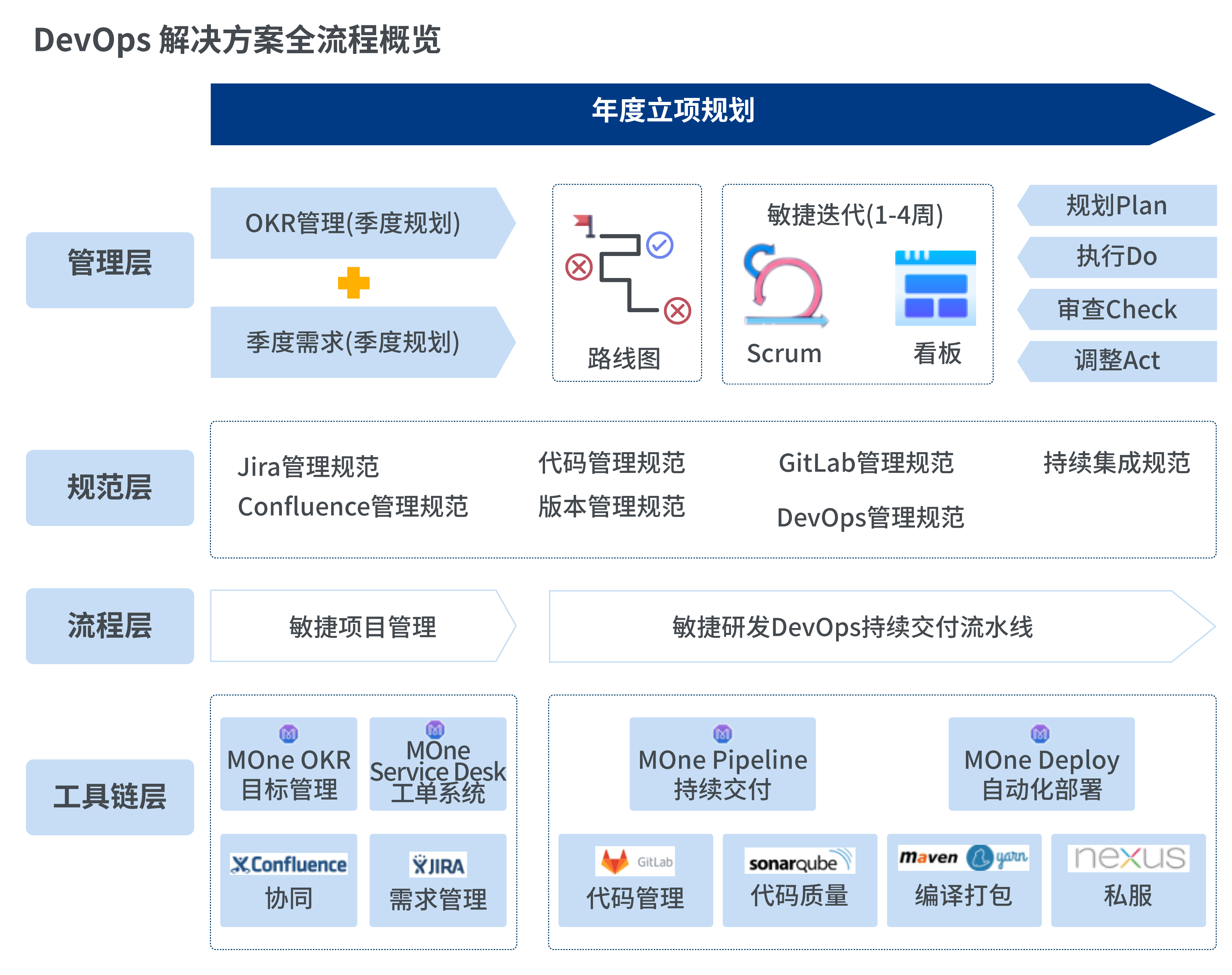 在實(shí)施 DevOps 過(guò)程中,基于 DevOps 理念,長(zhǎng)亮科技通過(guò)自研的一站式研發(fā)協(xié)同管理平臺(tái)(Manager One,以下簡(jiǎn)稱MOne平臺(tái)),實(shí)現(xiàn)了 DevOps 變革中工具的支撐,同時(shí)依托工具,制定了一套規(guī)范流程,將流程內(nèi)建于工具之中,通過(guò)工具來(lái)指導(dǎo)實(shí)踐。通過(guò)流程規(guī)范+工具機(jī)制,提煉了一套研發(fā)效能解決方案,即結(jié)合 MOne 平臺(tái)與應(yīng)用場(chǎng)景提供的敏捷項(xiàng)目管理、DevOps持續(xù)交付流水線及外部工單支持系列解決方案。