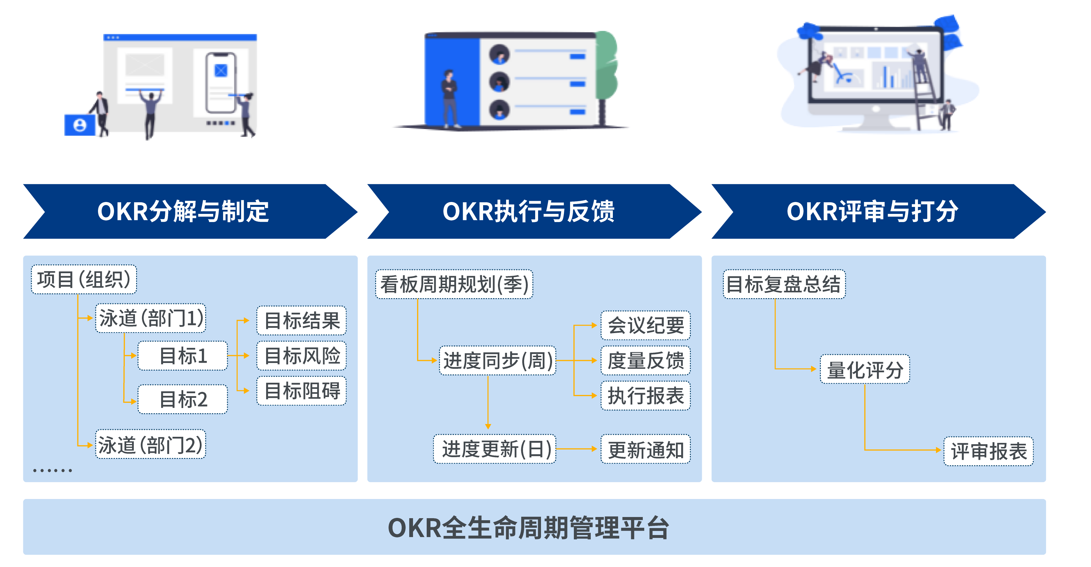 Mone OKR 是一個(gè)將 OKR 管理方法實(shí)施落地的企業(yè)協(xié)作平臺(tái)。OKR(Objectives and Key Results)即目標(biāo)與關(guān)鍵成果法,是一套明確和跟蹤目標(biāo)及其完成情況的管理工具和方法。Mone OKR將工具與理念相結(jié)合,為OKR 的落地提供平臺(tái)工具支持。MOne OKR結(jié)合 OKR 管理方法,基于“敏捷”理念,提供可視化看板模式,實(shí)現(xiàn)團(tuán)隊(duì)OKR全流程公開透明,通過(guò) OKR分解制定、執(zhí)行反饋與評(píng)審打分等功能,對(duì)OKR全生命周期進(jìn)行管理,同時(shí)集成企業(yè)微信群機(jī)器人通知,實(shí)現(xiàn)實(shí)時(shí)跟進(jìn)反饋進(jìn)度,確保目標(biāo)達(dá)成。
