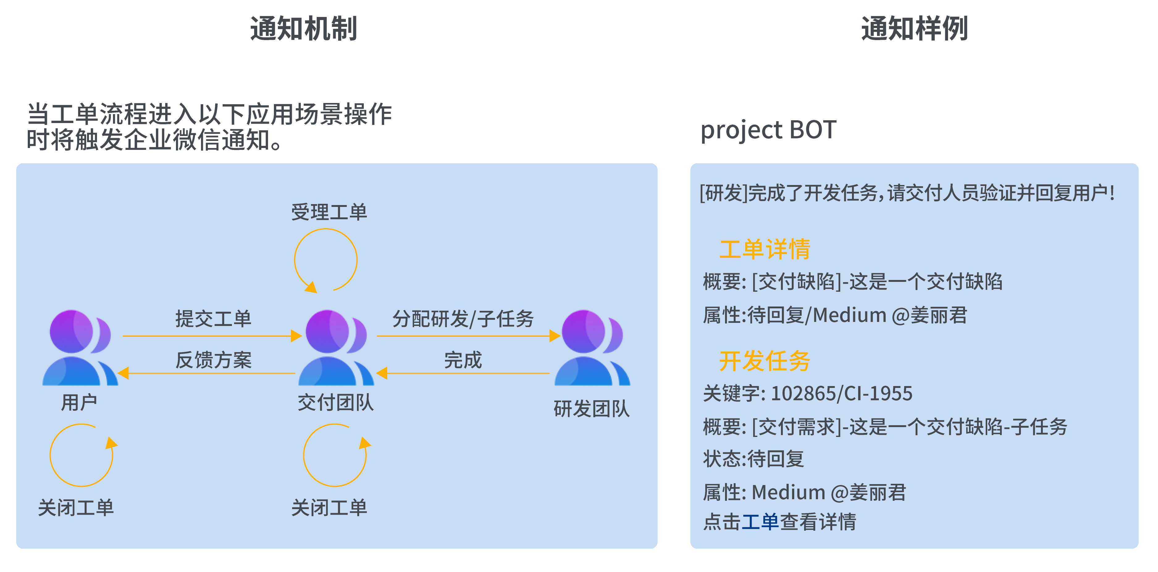 ◆企業(yè)微信通知機(jī)制:工單集成了企業(yè)微信機(jī)器人通知,當(dāng)工單階段流轉(zhuǎn)時(shí)將觸發(fā)企業(yè)微信通知。