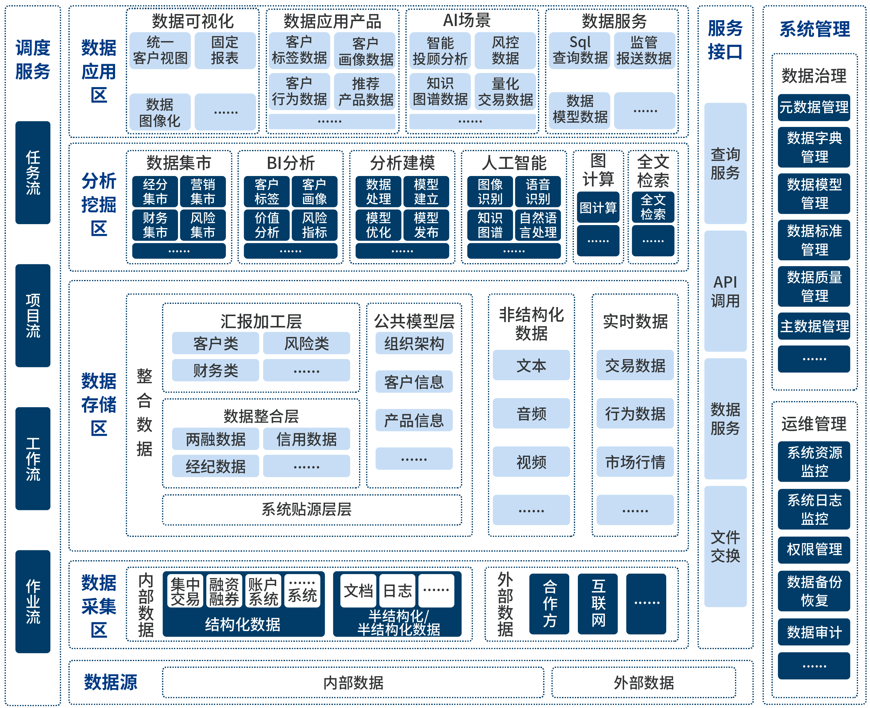 隨著證券行業(yè)大環(huán)境的變化,證券公司為實現(xiàn)業(yè)務戰(zhàn)略轉型、業(yè)務變革與創(chuàng)新發(fā)展,對數(shù)據(jù)的分析、應用提出了更高的要求?;诖髷?shù)據(jù)平臺,可有效整合企業(yè)內(nèi)外部數(shù)據(jù)信息,構建金融科技基礎能力,為證券公司業(yè)務拓展提供數(shù)據(jù)應用、數(shù)據(jù)分析、數(shù)據(jù)洞察決策等敏捷支撐。